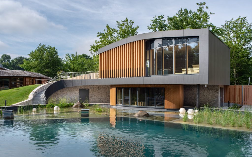 Le sauna panoramique et aux nénuphars, qui a ouvert ses portes en 2019, est le point culminant de l’espace sauna. Le design moderne et naturel est particulièrement remarquable. Visuellement, le sauna ressemble à un pavillon qui se dresse sur une grande colonne dans le paysage. L’utilisation de matériaux de construction naturels (bois et pierre naturelle) ainsi que la fusion du bâtiment et de la nature font d’un sauna une expérience particulièrement unique et respectueuse de la nature.
